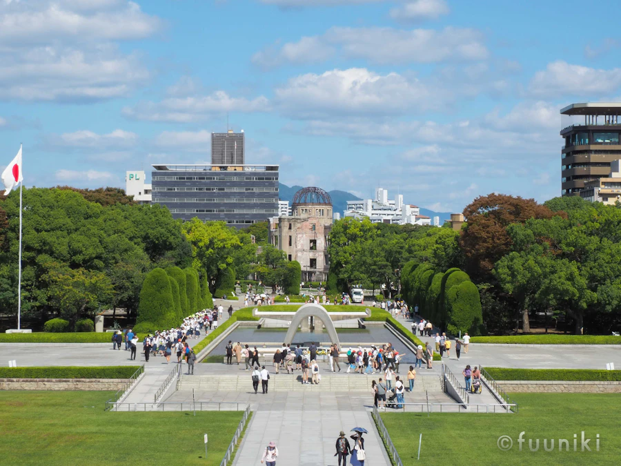 平和記念公園は広島市の中心部にある広大な公園で、世界の恒久平和を願って爆心地に近いこの場所に建設されました。