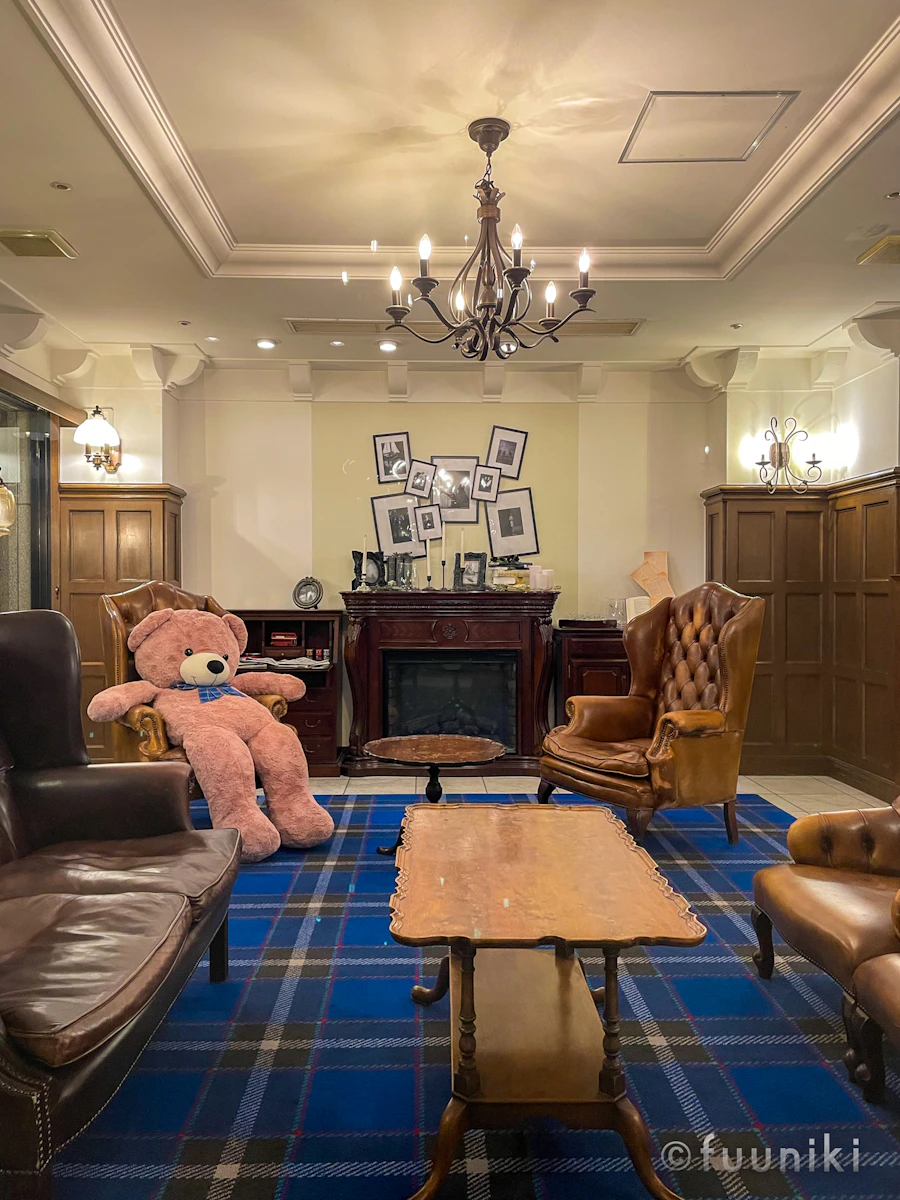 ホテルのコンセプトは「イギリス・ロンドン」。赤いミニクーパーが駐車していたり、イギリス風の衣装を着た熊のぬいぐるみが置かれていたりと、ヨーロッパの雰囲気が漂っています。