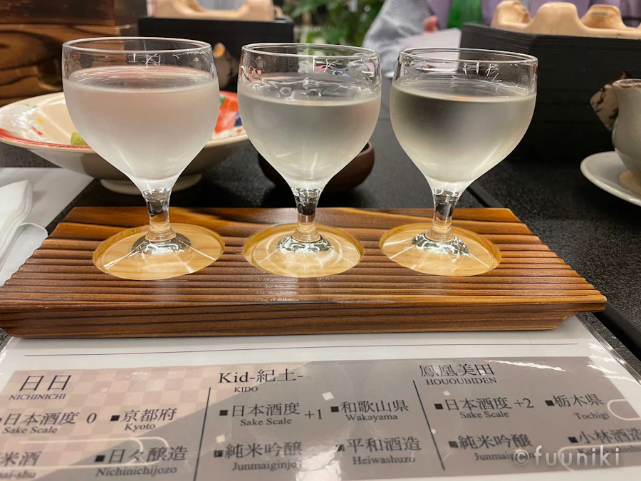 夕食では懐石料理をいただき、日本酒とともに堪能しました。この日の日本酒は「鳳凰美田」「紀土」「日日」。有馬とは直接関係ありませんが、香りが華やかでとても美味しかったです。
